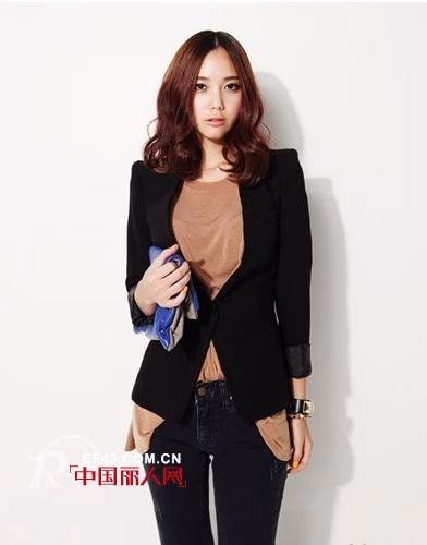 束腰黑色西装,肩膀处是一字的设计,对于肩宽的MM的来说,这款非常修饰身材的小缺陷。精致的裁剪,硬朗的风,凸显干练优雅的气质。内搭雪纺衫,下穿牛仔裤,简约帅气。