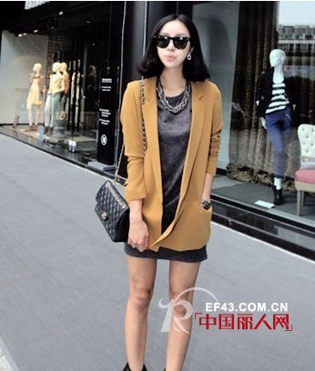 深灰色连衣裙打底,搭配了同色环扣项链,黑色的帅气短靴和链条包包朋克气息的上下呼应,姜黄色长款西装搭入,整体层次感升级。