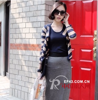 深蓝色基本款背心打底,灰色修身长裙,条纹开衫针织搭配,颜色上整体协调,很低调的打扮!