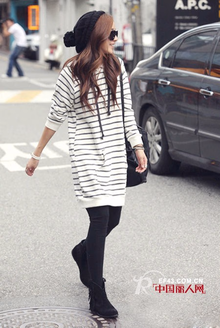 长袖款式,经典条纹配色时髦有型。怎么穿都不会过时的款式。底摆包臀款式,遮掩大PP的效果很赞。单穿或者是搭配打底裤、小脚裤都OK。