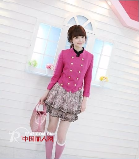 鲜艳的玫瑰粉色的精致短外套,小巧而挺括的小立领,非常的干练俏皮,挺括的衣身,非常的有型,显露出非常帅气的感觉,金属色彩的双排扣,显露出甜美的华丽色彩。