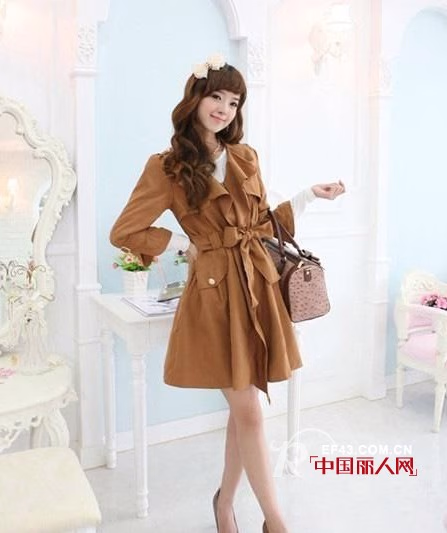 咖啡色彩的风衣,经典的长款线条,让身材的线条更加的高挑,衣领采用了重叠的菲边设计,显露出非常浪漫的色彩,腰身处采用了腰带搭配,显露出非常纤细的线条,非常的显瘦。