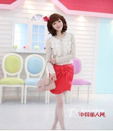 俏皮可爱拼接蕾丝针织短外套+鲜明甜美蝴蝶结半身裙