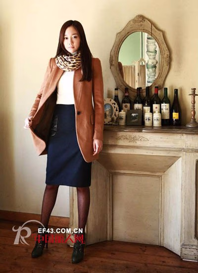 驼色长款的西装搭配职业裙,穿出成熟女性的大气和时尚,一款豹纹丝巾的修饰增添了几分强势的味道。