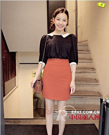 赫本的年代随处可见可爱的圆领,复古感十足的强烈,市面上的此类单品也各领风骚,选择适合自己的款式和颜色是最重要的。黑色圆领没有整个布满领子,微有距离,显得脖子很长,和袖口的白色包边呼应,内扎在橘红色修身短裙中,包包和鞋子都是简单的款式,因为真的不需要多余的修饰。