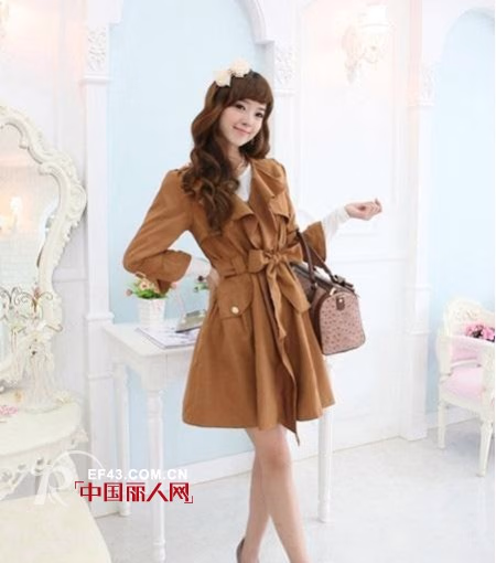 咖啡色彩的风衣,经典的长款线条,让身材的线条更加的高挑,衣领采用了重叠的菲边设计,显露出非常浪漫的色彩,腰身处采用了腰带搭配,显露出非常纤细的线条,非常的显瘦。