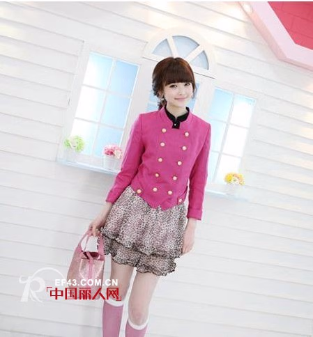 鲜艳的玫瑰粉色的精致短外套,小巧而挺括的小立领,非常的干练俏皮,挺括的衣身,非常的有型,显露出非常帅气的感觉,金属色彩的双排扣,显露出甜美的华丽色彩。