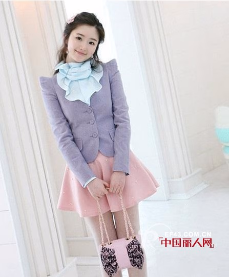 淡紫色的精致短外套,耸肩的线条,让肩部的造型更加的立体,细腻的面料,搭配上甜美的色彩,散发出小女人的温馨气息,圆润感觉的衣摆线条,非常的可爱呢。
