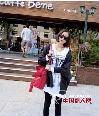 一看这身装扮小编就很爱呢!我的范儿啦!韩范儿MM都会大爱,白色人像大T恤+黑色打底裤,搭配了黑色宽大蝙蝠外搭,超级显瘦哦!红色包包很扎眼,赞!