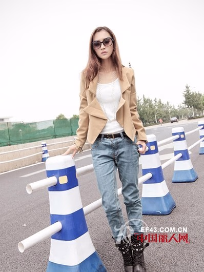 西装短外套+牛仔铅笔裤+系带抽绳半筒皮靴