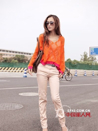 亮橘色的针织毛衣,鲜艳的色彩,给人以非常甜美的青春范儿,立体的菱格图案,隐约的透视感觉,非常的唯美而梦幻,松垮的线条,体现出轻松而甜美的休闲风范。
