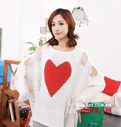 一眼就被吸引住的破洞针织衫,亮丽爱心图案+个性的铆钉装饰,不经意处理的破洞蝙蝠袖充满了秋天随意轻松的味道,搭配裙子一样的打底裤,甜美小性感魅力不可抵挡。