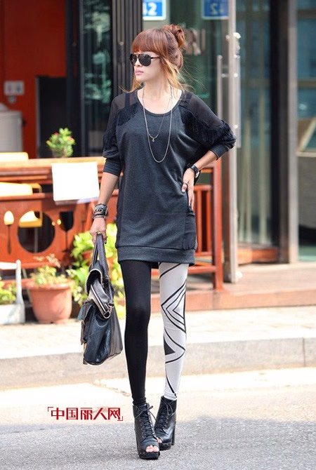 个性十足的几何图形加上纯色系的搭配,是不是很吸引人气呢?一向追求个性的你,一定不会错过这样一款哦。造型别致的打底裤让你感受十足时髦味道。
