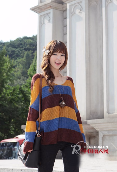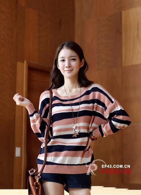 低调优雅款,宽条纹撞色宽松针织衫。大圆领剪裁,露出香肩锁骨的造型性感大方。蝙蝠式宽松版,透露出迷人气息。搭配紧身小脚裤再加一双高跟小短靴,一定让你清爽又时髦。