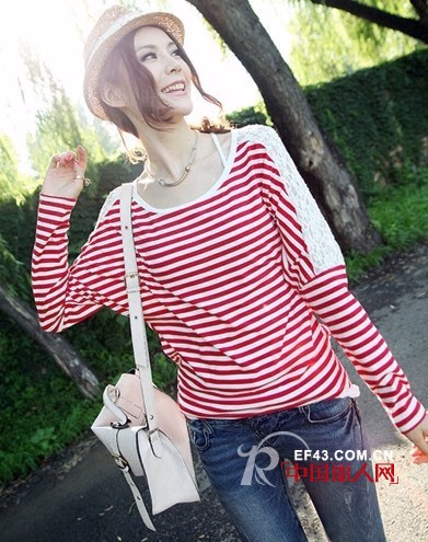 条纹与蕾丝的结合的t恤,无疑是大胆和前卫的,小飞袖与蕾丝花边连成一体。袖拼接黑色蕾丝的设计中 和了条纹的中性风,让条纹也瞬间妩媚起来,朦胧的蕾丝下若隐若现的肌肤。搭配牛仔裤,遮肉秀美腿。