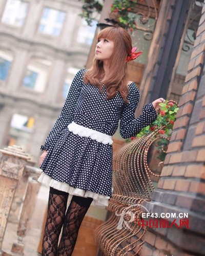 波点拼接长袖连衣裙搭配网眼丝袜,非常性感大气。腰际是白色花边构成的腰带款式,设计巧妙,很自然的就将纤细的腰身秀出来。清新的小波点更是复古风潮最完美的演绎。网眼黑色袜不用说是性感的代表。