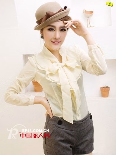 这款米色雪纺衬衫,雪纺面料今年的人气款,修身款,荷叶边加蝴碟结看起来不那么死板哦,长袖雪纺材料加人气短裙有木有很OL风呢。可以搭配短裤或是半身裙,将OL优雅气质尽显无疑。