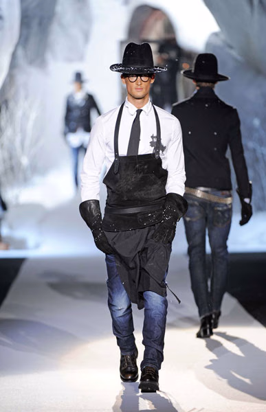 Henley汗衫则都与背带搭配。皮靴却是经过特殊做旧处理,以营造出一种复古感觉。同时,暗色水洗牛仔布拥有非常好的品质,绒面补丁也使得复古效果更佳真切,因为天鹅绒补丁点缀让其更加逼真。一个绝对的创新则来自于利用羊毛牛仔布来制作裤子和夹克。其裤子的颜色搭配以黑色为主调,配以黑色和白色及其米色,灰色和海军蓝色作为点缀。