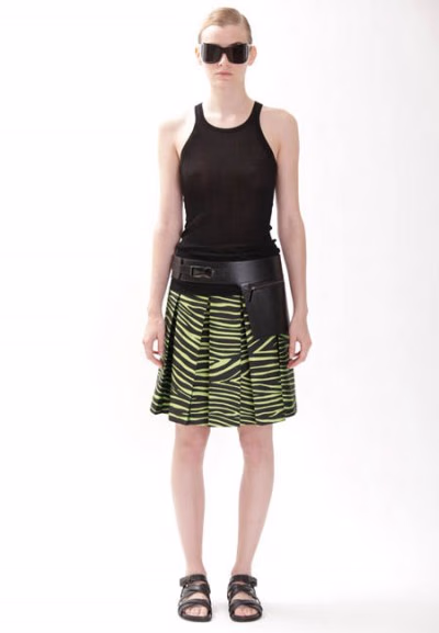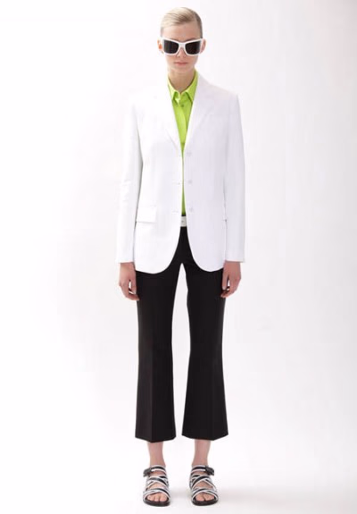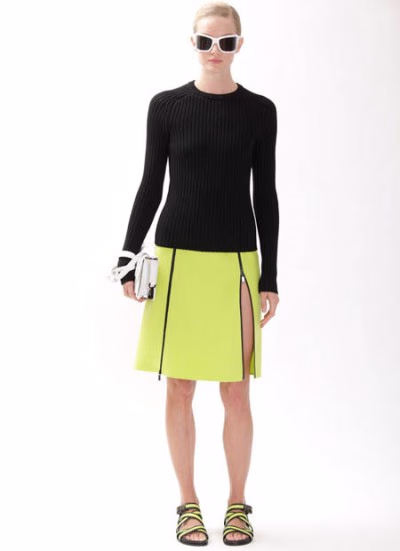 Michael Kors 2012早春度假系列但Kors完全是一个机会均等的设计师。他解释说,酸性绿、黑色的弹性潜水连衣裙和黑色紧身裤、及踝短靴适合纽约,裸露的腿部和平底人字拖适合加勒比海的St.Bart’s岛。他将这个系列描述为自己品牌一年中最重要的季节,用途广泛是这个季节的关键。服装的范围也是如此。明亮的图形阵容包括从六十年代的邦德女郎Ursula Andres式的比基尼和无袖的弹性仿羊羔皮网球裙,到10股纱的羊绒衫和羊绒/安哥拉羊毛混纺的双排扣水手大衣。