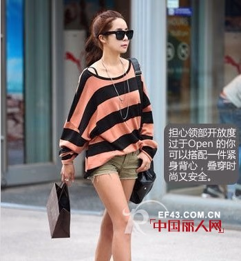 大版T恤圆润的半圆弧型结构,时尚的条纹针织衫领部的开放设计在整体轮廓中起决定作用,蝙蝠衫飘逸的造型让你成为视觉的焦点。搭配相应色系的热裤,秀出美腿没商量!