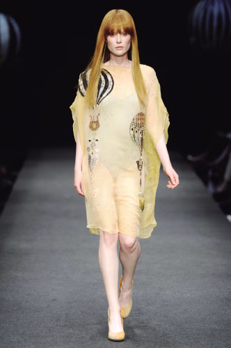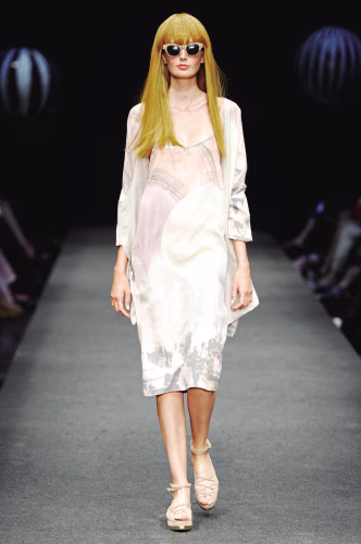 斯坦恩·戈雅(Stine Goya),这个与设计师同名的品牌,现在进入第5个年头,在位于市政厅的时装周官方展示场地里做发布。漂亮的皱褶装饰柔和色彩的衬衫,雪纺背心连衣裙层叠在荧光粉色的游衣之外,这个漂亮的色谱结束在桃红色的马海毛套头外衣上,而黑色束带的斜纹棉布长裤上添加了一种孩子气的元素。瓷娃娃般的模特们都戴着金发假发,配合生硬的条纹的、模仿戈雅的自己外观。