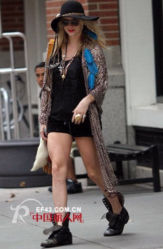 钱妞的这身“犀利”造型可谓是有板有眼,收起性感的钱妞这身搭配十分抢镜,黑色热裤和背心外搭印花披肩时尚个性,当然最出彩的还是这双没系带的平跟马靴。