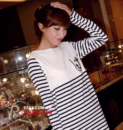 船锚钩花长款条纹T恤,属于百搭潮品,搭配很方便,为一本正经的你增添不少顽皮可爱。长袖长款正好应对早秋多变天气,下穿打底裤修身显瘦,也可以穿牛仔裤休闲时尚,看自己的喜好。