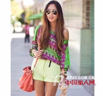 宽松蝙蝠衫最好应对这“秋老虎”,免于过晒也会很透气。配搭柠檬色短裤,打造小小身材比例。包包的橘红色形成紫色与黄色的中间色,上下过渡非常赞。