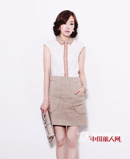 拼接式的衬衫,搭配半裙,半裙的色彩与拼接的色彩一致,整体给人和谐感,完全的呼应不突兀,整体的搭配就是一种成功。