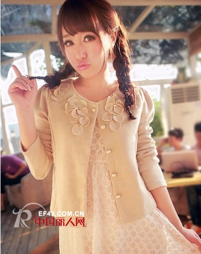这款裸色秋装小外套,一朵朵精致的立体花朵盛开在领口,相当的雅致,给整件开衫增添了优雅的气息。每一个花瓣都是的手工定制的,形状不一的花朵交错排列,配上珍珠的纽扣,低调而内敛。内搭蕾丝连衣裙,超有淑女味,清甜可爱,唯美浪漫。