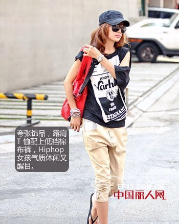 这款涂鸦的蝙蝠衫新颖的款式以及细节上的打点成为了人们视觉的焦点。黑白鲜明的色泽,时尚的露肩设计塑造了都市女性的新形象,突出性感的身材,配搭修身七分裤可以起到收缩腿部的效果,使下身更显苗条。