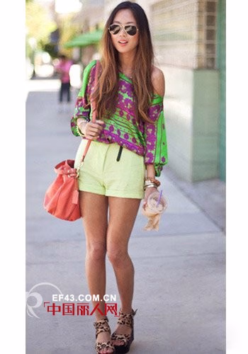 宽松蝙蝠衫最好应对这“秋老虎”,免于过晒也会很透气。配搭柠檬色短裤,打造小小身材比例。包包的橘红色形成紫色与黄色的中间色,上下过渡非常赞。