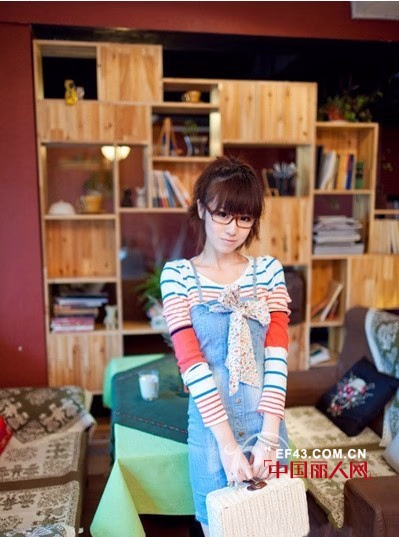 海军风的条纹T恤,和蝴蝶结牛仔裙的搭配,修身的同时又很显瘦,超甜美可爱的搭配哦。胸前还有蝴蝶结系带,清甜可爱,很有淑女的气质啦。