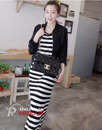 鲜明的黑白条纹色彩的长款连衣裙,经典的色彩,给人以非常优雅的怀旧气息,修身的长款线条,让身材更加的高挑有型,外搭黑色的小外套,神秘的色彩,显露出性感的气息。