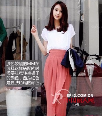 每天都在说大长裙是今夏必备款,上街满眼看去也都是大长裙,但是搭配要配对!纯白色基本款宽松T恤和美丽的西瓜红长裙搭配,这是一个最今本的白色搭配方案,也比较不容易出错。裙子的不规则裙摆是个大亮点,宽边的设计腰部能更好的收敛腰线。