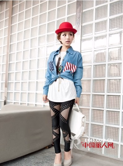 米字中袖T恤+黑色珋钉打底裤外搭牛仔衬衫,皮质的米子装饰和围在米字旁边的珋钉非常的上档次,衣服袖子是很大特色,还可以随意的披上件保暖的牛仔衬衫,可以很复古,也可以很潮。
