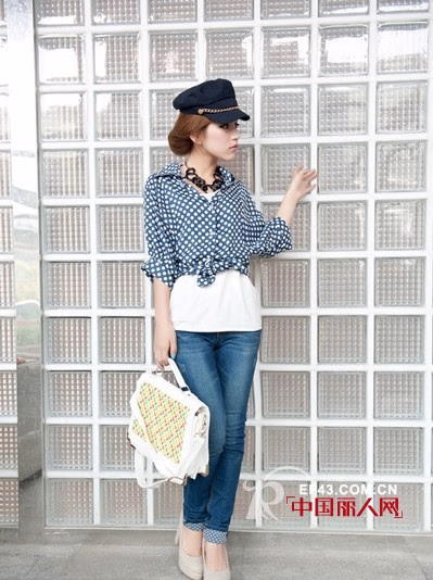 圆点蓝色衬衫+白色背心+牛仔裤,圆点的蓝色衬衫穿的很有FEEL,搭配的更加可爱,比如说搭配一条裙子或者短裤,都很OK,这样的搭配风格,非常清新甜美,简约时尚。