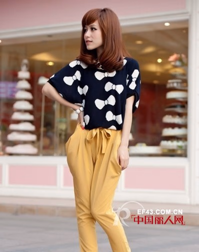 宽松T恤衫搭配土黄色哈伦裤,非常出彩的搭配。白色蝴蝶结图案在蓝的底色中熠熠生辉,甜美不失俏皮浪漫。哈伦裤更是时尚大气,唯美浪漫的演绎着最潮流的时尚风格。