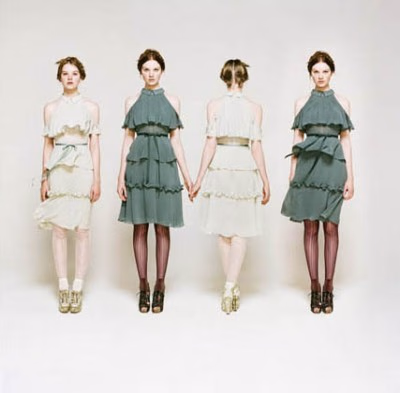 然而“理智与情感”其实不可分割。Rodarte 2011秋季Look Book由Kate及Laura Mulleavy合作完成。该系列将饱含着北欧浪漫主义乡愁的爱德华时代气息与洛丽塔风格结合,借此Look Book为新店的开幕仪式献礼。娇嫩的荷叶边、柔美的线条、灵动的印花和粉彩色调,使这个系列营造出一种清新的梦境般质感。模特Gwen Loos和她的孪生姊妹Donna合作无间,在摄影师Frequent Collaborator的镜头前犹如秋季仙子一般。