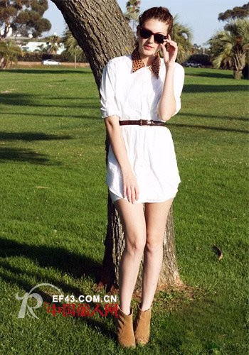 中性白衬衫绝对是百变高手哦。五分袖会让上身看起来更简约大方。穿插腰带划分身材比例,建议细腰带为佳,不会暴露你的“小轮胎”哦。鞋子真的会衬托你的双腿更显修长,选择及踝靴,不羁个性一下显示。