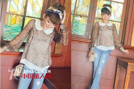 很是味道的豹纹雪纺衫,搭配为喇叭破洞牛仔裤以及厚底坡跟单鞋,有点复古的味道,十足的女人妖娆味,颇有明星的时尚味道。
