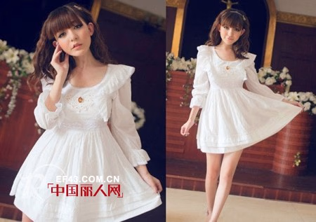 宫廷风长袖连衣裙,收腰又显可爱,白色的连衣裙搭配圆头的高跟女鞋,甜美清纯很有公主范。