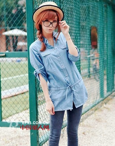 长款牛仔蓝衬衫,腰部抽绳设计,可以根据身材自行调节,设计巧妙,中袖还有搭扣的设计,更是别致精巧。搭配牛仔裤,帅气简约,时尚清爽,很好看。
