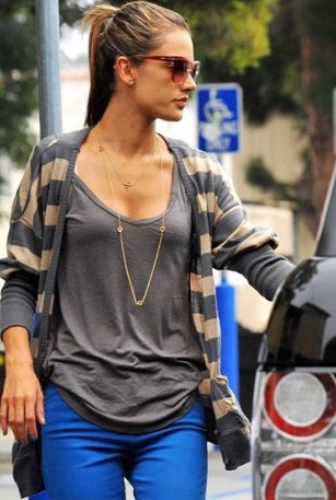 时尚解析:秋天还史针织开衫的季节,易搭配易加减的服装特性使它成为了大家喜爱的服装单品。这身深灰色宽条纹针织开衫和宝蓝色铅笔裤的搭配不功不过,是最常见的搭配。