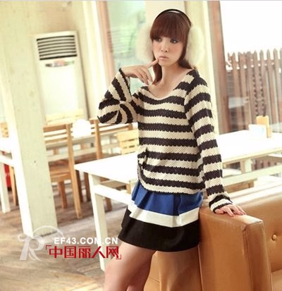 黑白条纹针织衫,经典的黑白条纹可是绝对的百搭款,不挑人好搭配,超级基础的配色, 有着大大的圆领,袖口略显喇叭状,甜美中自然流露出小小的性感。搭配三色条纹半身裙,没有一丝的累赘,却更添淑女可爱的气息。
