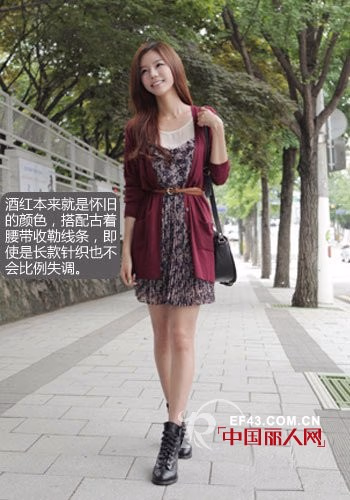 紫红色长款针织衫十分帅气,注重细节的腰带设计更加打造高品质感,紫色花朵裙让整体搭配更加优雅,是办公室白领的不错选择。既免除了单穿连衣裙特别是无袖或吊带裙装的不正式,又不会像西装套裙那样容易热和死板。