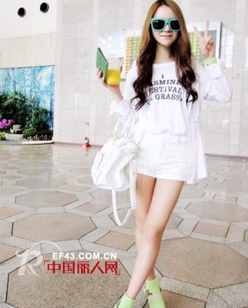字母宽松Tee内扎进白色热裤里面,衣服要记得被拉出哦,有效遮挡腰间游泳圈,白色衬衫的搭配让整体很干净,荧光的袜子和手链呼应,虽然荧光的地方很少,但是整体的颜色搭配非常赞!