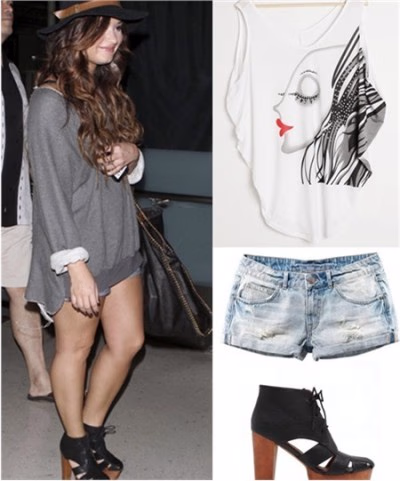 时尚解析:长款的T恤搭配短裤,短裤微露,让人遐想,木低的高跟鞋与宽檐帽相呼应。