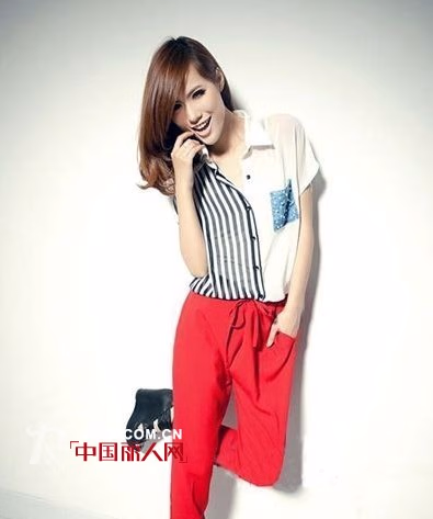 这款拼接条纹衬衫。设计很独特。一侧是黑边竖条纹,一侧是口袋装饰裸色拼接,超有个性魅力哦。柔软舒适的面料,精致的裁剪,绝对是MM的大爱。服饰图片中搭配红色的休闲长裤,就很大气时尚哦。