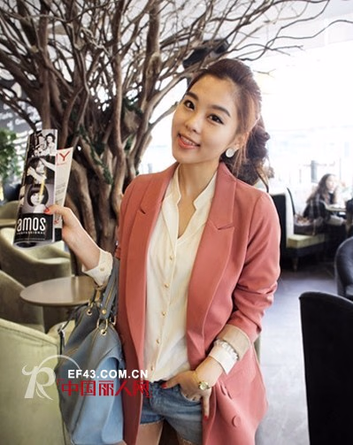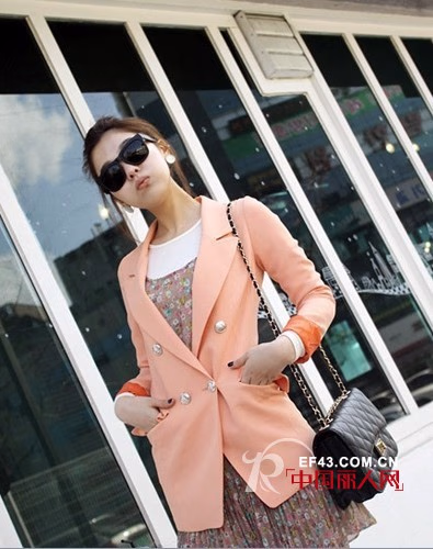 糖果色彩的修身西服,细腻的面料,挺括的线条,给人以非常干练的感觉,小巧而有型的翻领设计,搭配上甜美的色彩,可爱中提升干练,充满了迷人的色彩。